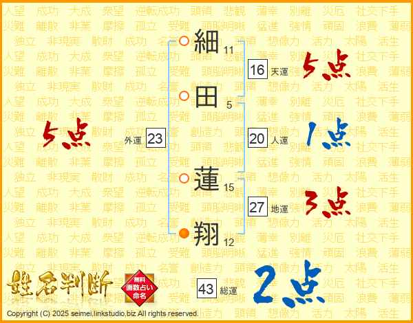 一二三蓮翔 男性 の姓名判断 診断結果 名前の字画数で運勢を占う 無料姓名判断サイト いい名前ねっと